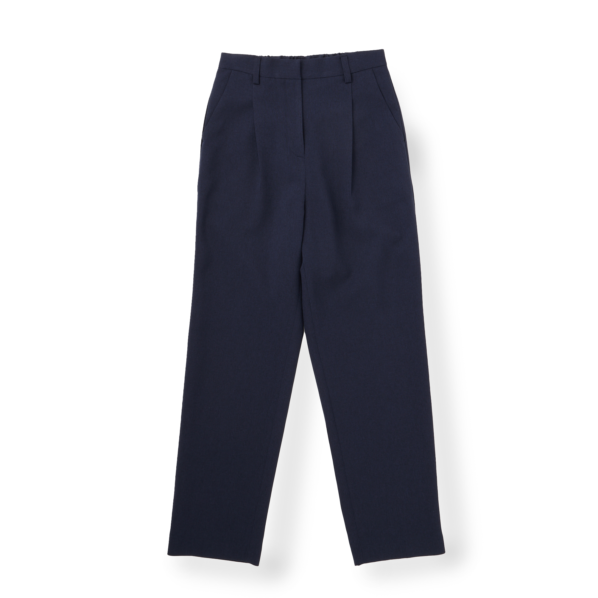 薄手で程よい張り感があるすっきりとしたテイパードラインパンツです。後ろゴム仕様、裏地付き、しわにならないイージーケア素材