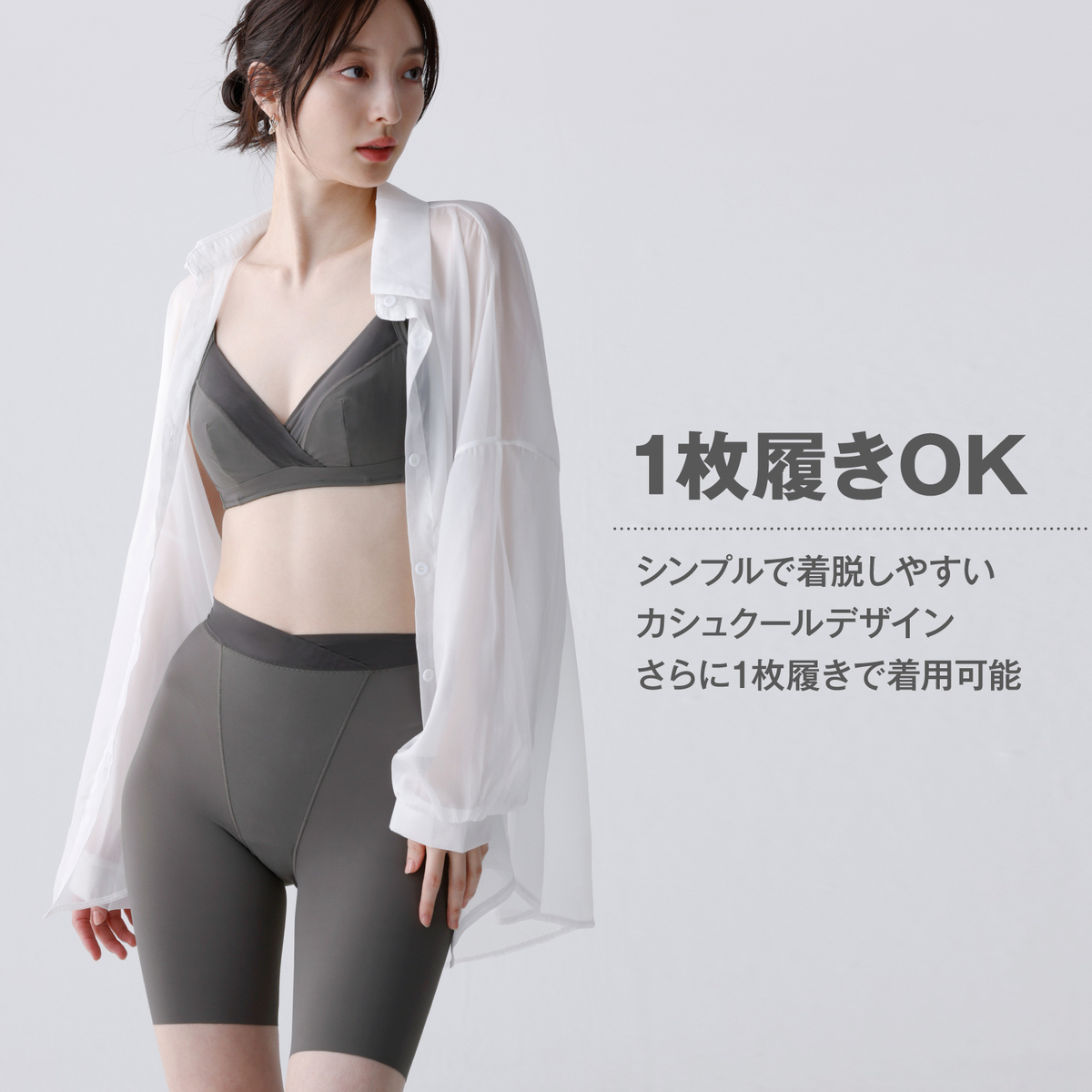 ◆ポイント1:1枚履きOK<シンプルで着脱しやすいカシュクールデザイン。さらに1枚履きで着用可能。>