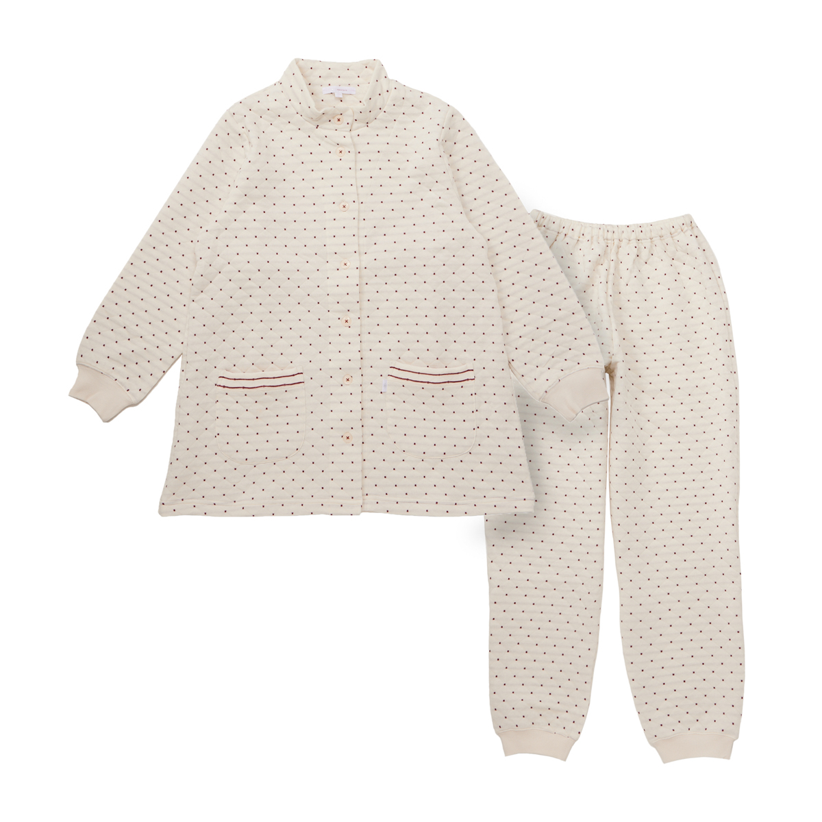 秋冬に大人気の≪ニットキルト≫は表生地と裏生地の間にわたを挟み込んだふんわりとした暖かい素材です。表も裏もコットン100%で静電気も起きにく肌に優しい素材です。袖口・足口はリブ仕様で保温性を高めるデザインです。