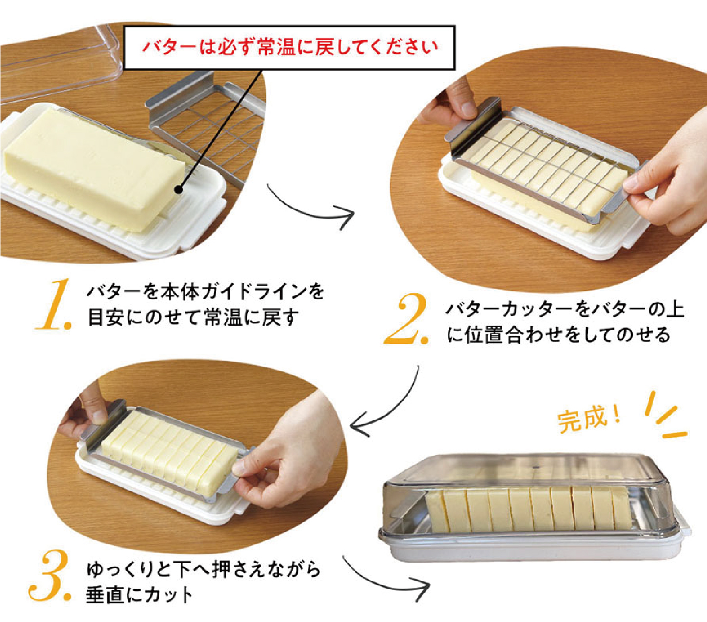 ※冷えて固いバターをカットすると、カッターが変形するおそれがあります。必ず常温に戻して柔らかくなったバターでご使用ください。
