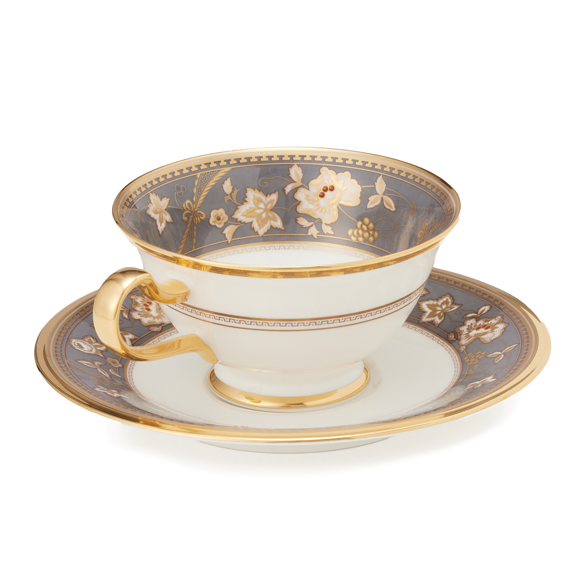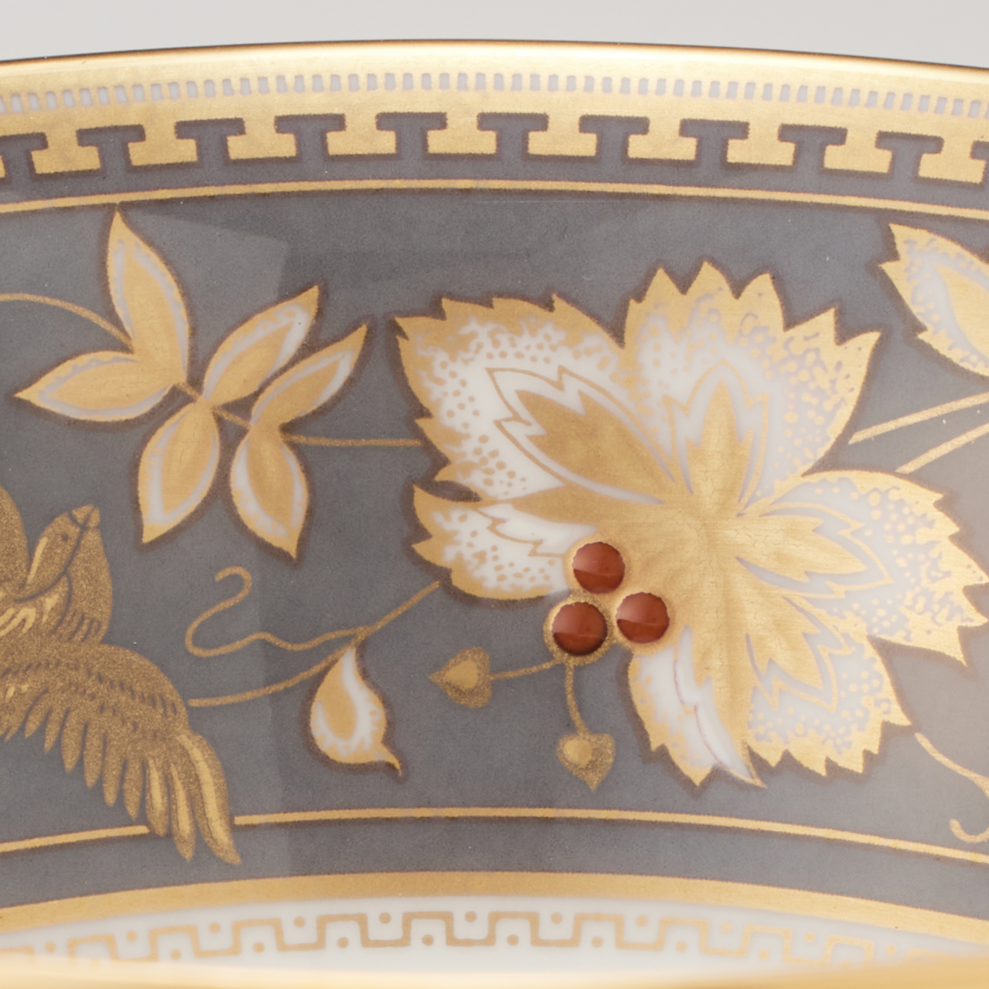 黄昏時の光のような金色に縁取られて、ほんのり浮かび上がる花鳥の風雅。そのきらめきは、なごやかな饗宴に荘厳な趣をたたえます