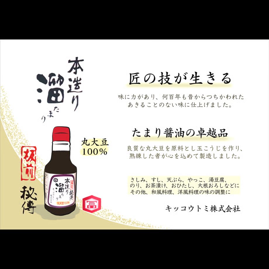 良質な丸大豆を原料としたグルテンフリーの溜りしょうゆにみりんを加えまろやかに仕上げました。一般的な濃口しょうゆと比べ、味がまろやかで旨みが強いのが特徴です。さしみ、お寿司用のつけしょうゆの他、煮物、煮魚、照り焼きなどの和風料理、ビーフシチュー、デミグラスソース、カレーなど洋風料理の隠し味にもお使いいただけます。
